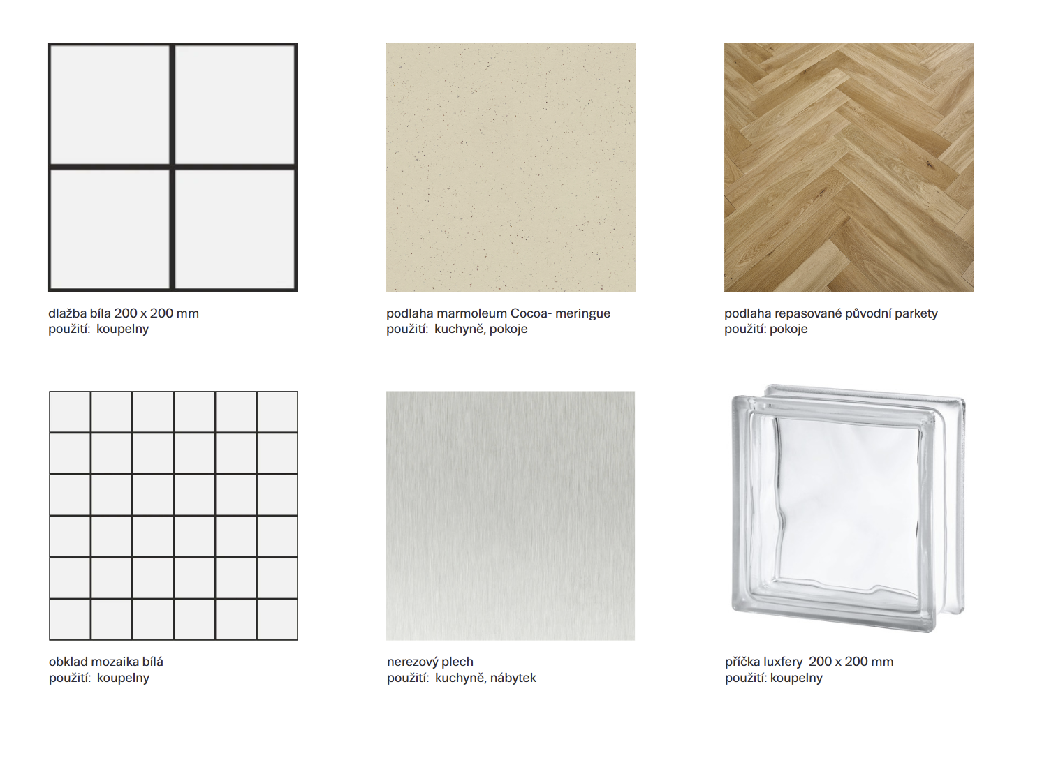 V pokojích nově repasované dřevěné parkety nebo marmoleum, případně dle výběru klienta.